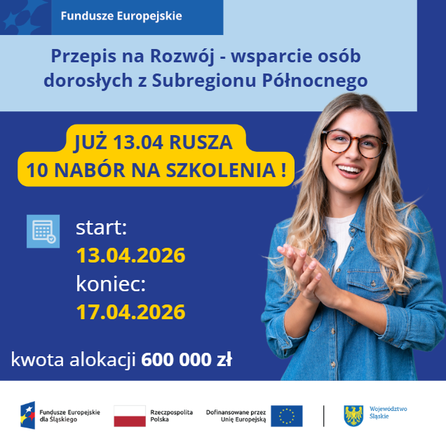 informujemy, że 13 kwietnia 2026 r. rusza dziesiąty nabór w ramach Projektu „Przepis na Rozwój – wsparcie dla dorosłych z Subregionu Północnego", skierowany do osób dorosłych z Subregionu Północnego woj. Śląskiego (Częstochowa, powiat częstochowski, powiat kłobucki oraz powiat myszkowski). Masz szansę podnieść swoje kwalifikacje, zdobyć certyfikaty lub przejść proces walidacji – wszystko w ramach dostępnych środków!