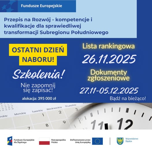 Jeśli jeszcze nie zgłosiłeś się na bezpłatne szkolenia w ramach projektu „Przepis na Rozwój – kompetencje i kwalifikacje dla sprawiedliwej transformacji Subregionu Południowego", to… właśnie nadszedł ten moment!