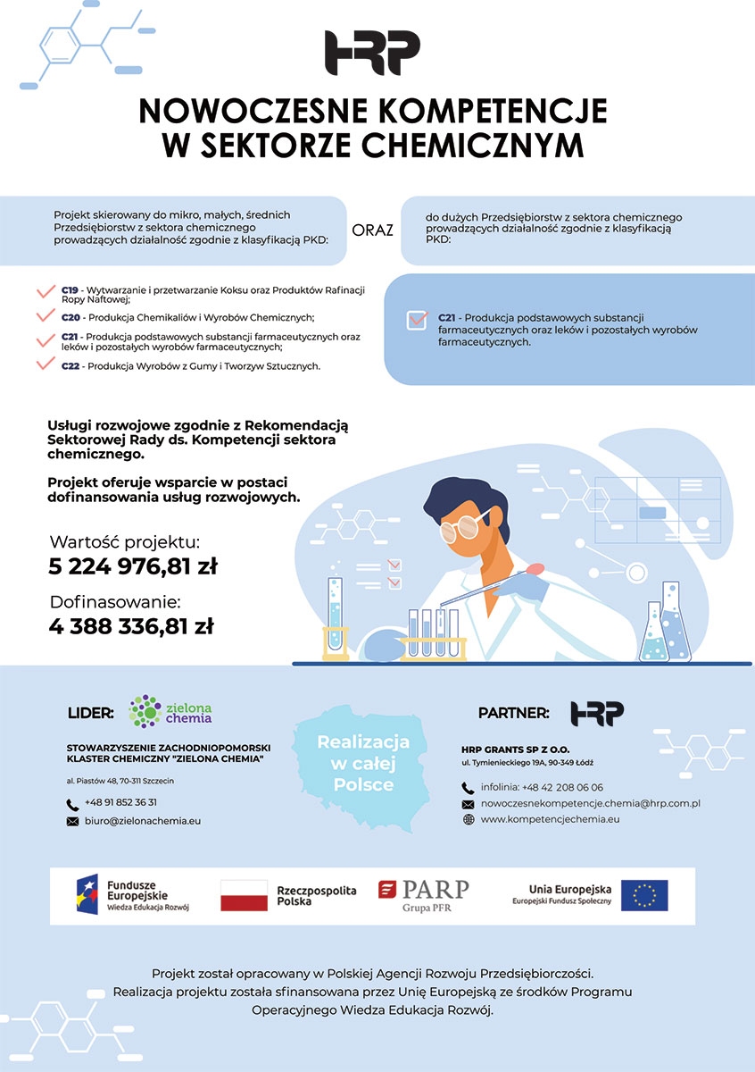 „Nowoczesne Kompetencje w Sektorze Chemicznym". Projekt jest realizowany w ramach ogólnopolskiego konkursu Polskiej Agencji Rozwoju Przedsiębiorczości (PARP) „Kompetencje dla sektorów", współfinansowany ze środków Europejskiego Funduszu Społecznego w ramach Programu Operacyjnego Wiedza Edukacja Rozwój, Oś Priorytetowa II Efektywne polityki publiczne dla rynku pracy, gospodarki i edukacji, Działanie 2.21 Poprawa zarządzania, rozwój kapitału ludzkiego oraz wsparcie procesów innowacyjnych w przedsiębiorstwach.